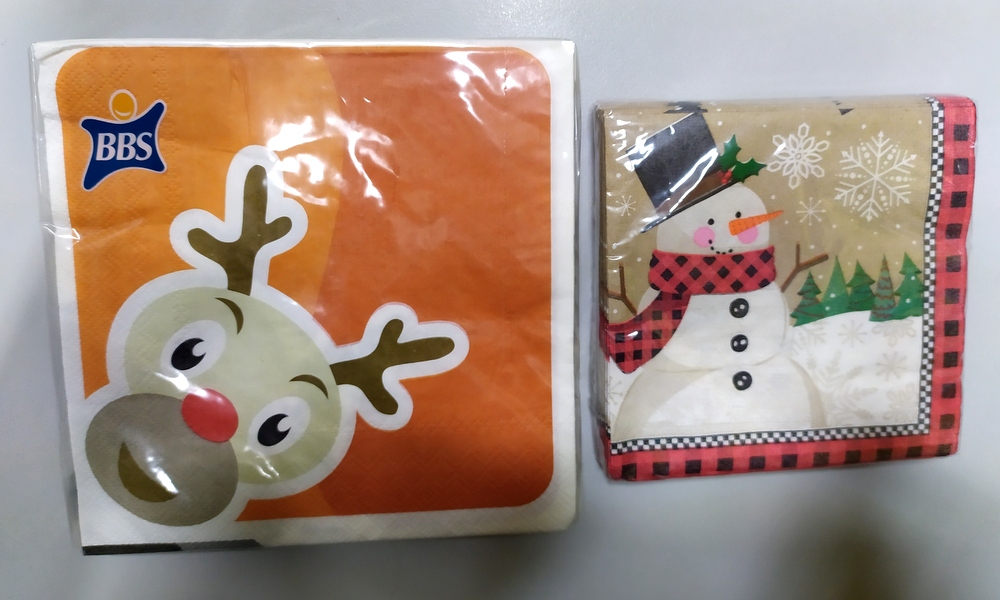 Χαρτοπετσέτες χριστουγεννιάτικες. Η συσκευασία περιέχει 16 τεμάχια, αυτή με τον τάρανδο 20 τεμάχια και αυτή με το χριστουγεννιάτικο στολίδι 36. Διατίθενται σε διάφορα σχέδια και μεγέθη ανάλογα με τη διαθεσιμότητα.